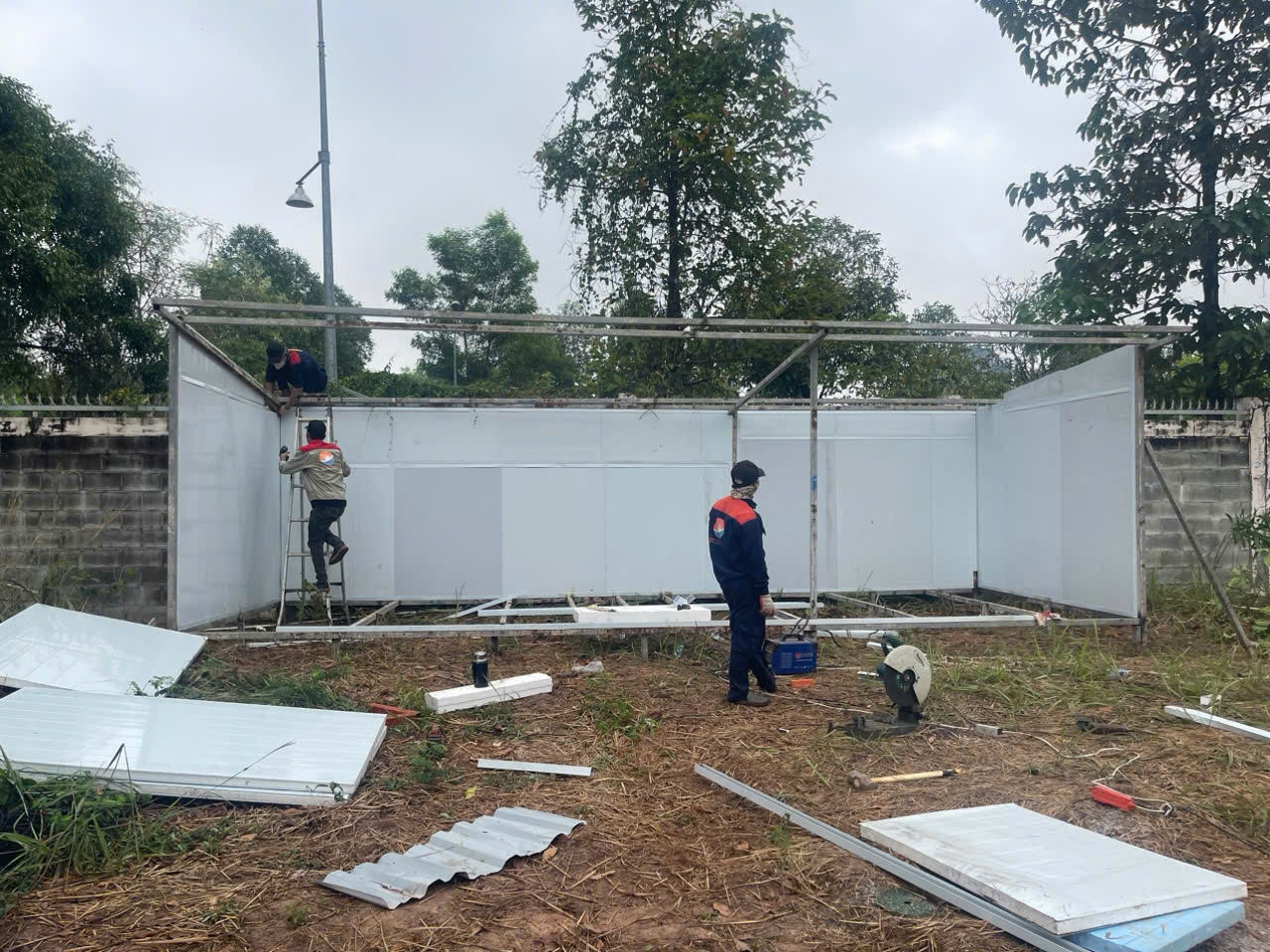 Trước Tết Nguyên đán, Công ty Anh Phát đã nhanh chóng triển khai dựng hàng rào tạm bao quanh khu vực thi công, đảm bảo an toàn và bảo vệ công trình. Mới đây, công ty tiếp tục thực hiện việc xây dựng nhà nghỉ cho nhân viên để đảm bảo điều kiện làm việc ổn định và tiện nghi trong suốt quá trình thi công. Đồng thời, các công tác đấu nối điện nước cũng đang được triển khai để cung cấp đầy đủ cơ sở hạ tầng thiết yếu cho công trình.