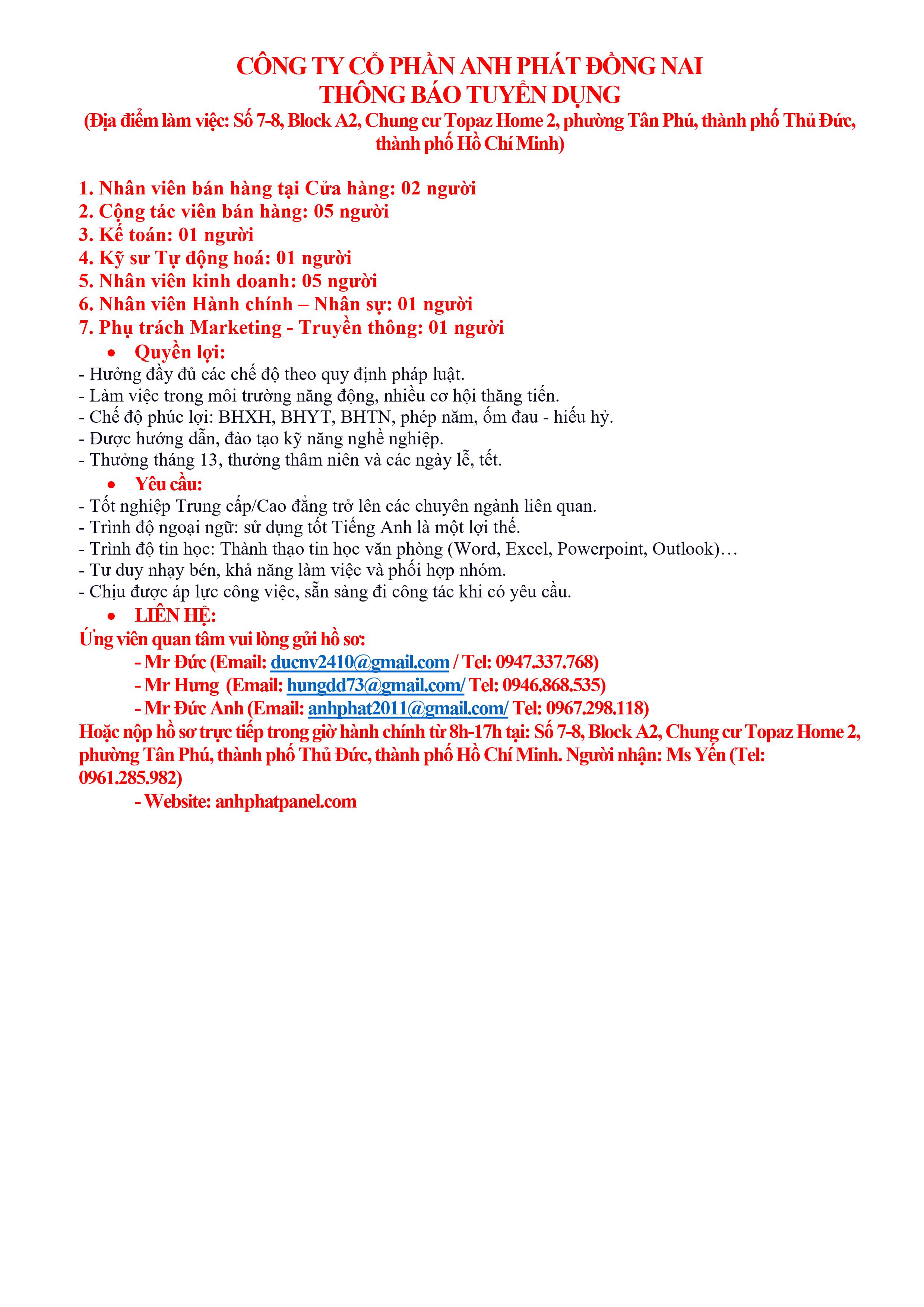 Công ty Cổ phần Anh Phát Đồng Nai (Công ty con của Công ty Anh Phát) chuyên sản xuất Panel, Tôn 3 lớp PU,..., thi công Nhà lắp ghép thông báo tuyển dụng nhân sự các vị trí như sau: