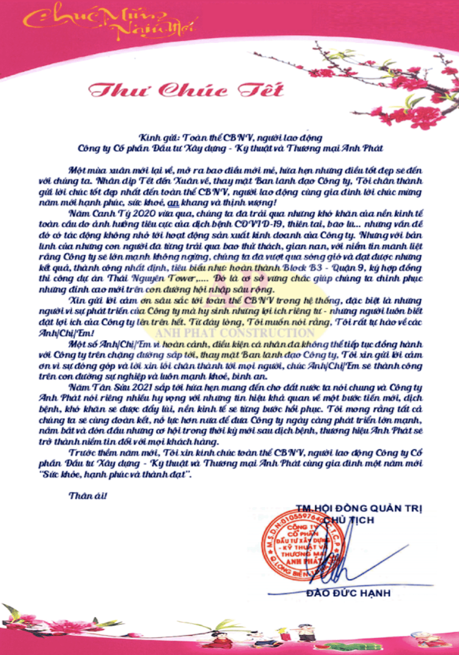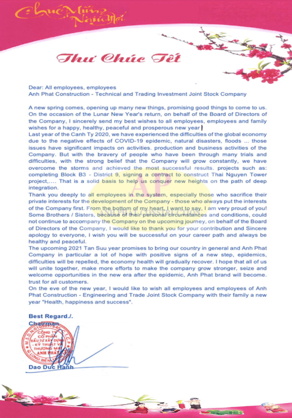 Thư chúc Tết Nguyên đán Tân Sửu 2021 của Chủ tịch Hội đồng quản trị Công ty Cổ phần Đầu tư Xây dựng - Kỹ thuật và Thương mại Anh Phát gửi tới toàn thể CBNV, NLĐ đã và đang công tác tại Công ty trong suốt thời gian vừa qua.